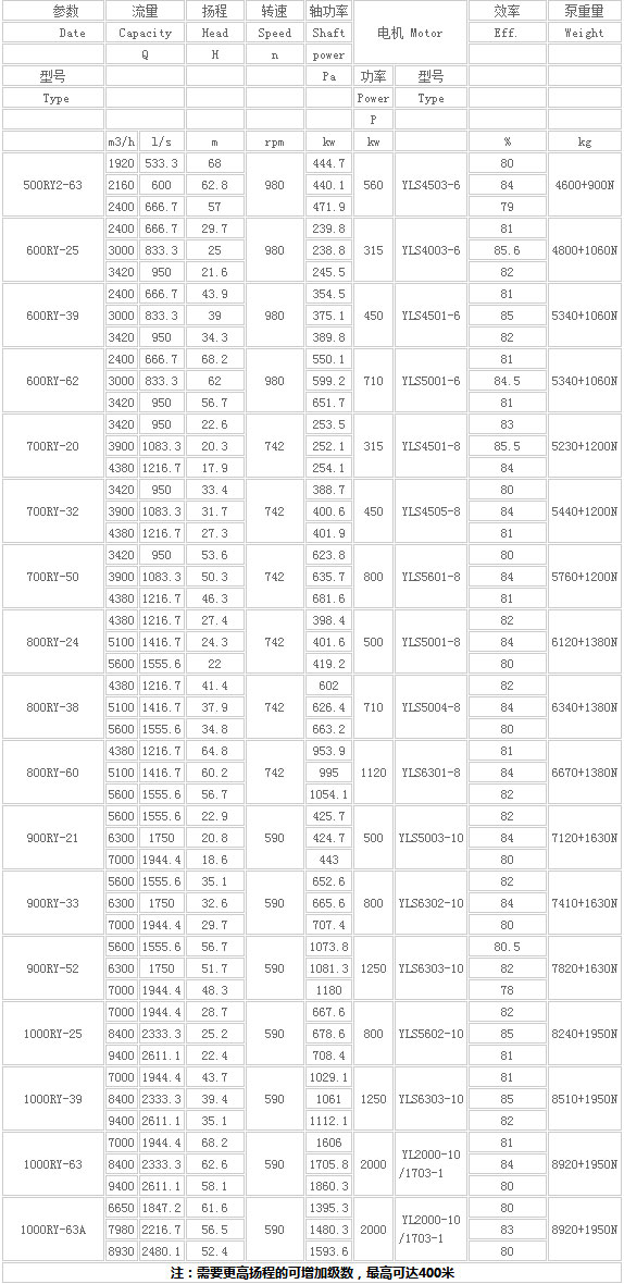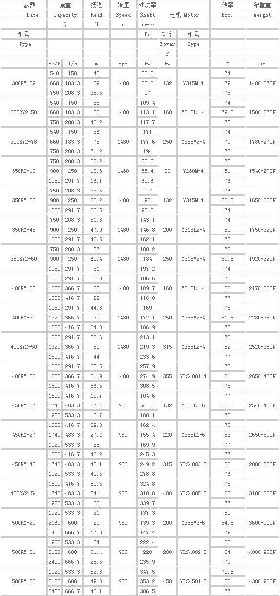 RY型熔鹽液下泵性能參數表
